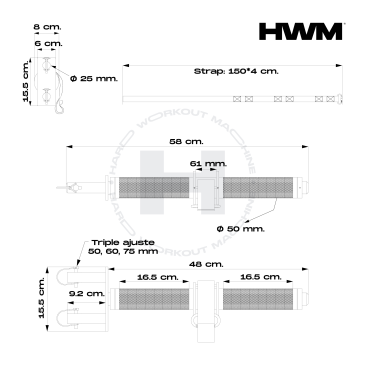 Algunas de sus principales características son... Doble funcionalidad: Adaptador compatible con todas las series de Racks HWM®, Delta, Alpha y Magnum. Construcción de acero sólido: Fabricado con acero de alta calidad y cojinetes suaves para una rotación fluida y una durabilidad extrema. Agarre ergonómico y antideslizante: Sus manijas moleteadas de 50 mm de diámetro y 16.5 cm de longitud proporcionan una sujeción cómoda y segura. Accesorios incluidos: Viene con una resistente correa de nailon de 150 cm de largo y un mosquetón para que puedas empezar a usarlo de inmediato. Fácil de montar: La versión para rack incluye collares de eje, un panel de montaje y doble pasador de retención para una instalación rápida y segura.
