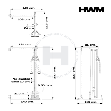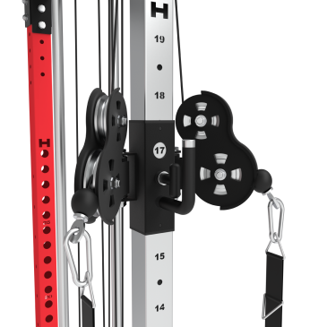 Con un peso máximo de carga de 120 kg y un sistema de poleas con relación 2:1, cada repetición se siente suave y fluida. La altura de las poleas es fácilmente ajustable a 19 posiciones cada 10 cm con un simple pasador, haciéndola apta para cualquier atleta. Puedes utilizar las poleas simultáneamente o por separado.
