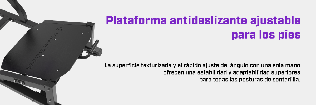 La plataforma antideslizante texturizada proporciona una base estable con múltiples opciones de postura. Con un mecanismo de ajuste de cinco posiciones con una sola mano, los usuarios pueden ajustar fácilmente los ángulos de la plataforma para adaptarse a la movilidad variable del tobillo, reducir la fuerza de cizallamiento de la rodilla y prevenir lesiones por sobreuso, ofreciendo una experiencia de sentadilla más segura, fluida y eficiente.