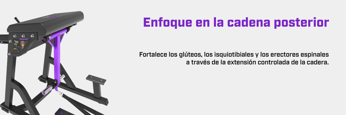 Las hiperextensiones inversas se centran principalmente en fortalecer la cadena posterior, que incluye la zona lumbar, los glúteos y los isquiotibiales. Al realizar este ejercicio, se trabajan estos grupos musculares, lo que ayuda a desarrollar resistencia y estabilidad. El Reverse Hyper es una máquina segura y eficaz, popular entre quienes realizan levantamiento de pesas pesado, ya que complementa el entrenamiento de espalda y ayuda a desarrollar la fuerza en los erectores espinales, glúteos e isquiotibiales.