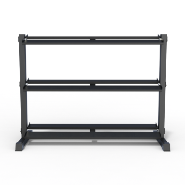 Este rack no es solo un estante; es un sistema de almacenamiento diseñado pensando en la seguridad y la comodidad del atleta. Sus tres bandejas horizontales cuentan con un diseño inclinado y un canal protector que guía las mancuernas a su lugar. Esto te permite tomar y dejar las pesas de forma segura, sin forzar la espalda ni correr el riesgo de pellizcarte los dedos entre los pesos.