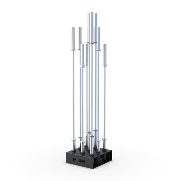 El soporte de almacenamiento está construido para organizar hasta nueve barras olímpicas dentro de una unidad de almacenamiento de acero duradero, muy firme y estable. Este rack de piso compacto cuenta con nueve tubos de acero con revestimientos de plástico de nailon para proteger las fundas de las barras contra rasguños al insertarlas o quitarlas.